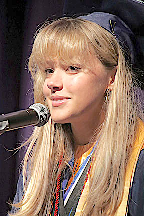 "To my father -- for teaching me what hard work and dedication truly mean. "And to my best friends -- for showing me that family can be chosen, and for inspiring me every day. You have shown me what it means to choose to love people unconditionally. You are some of the best people I know. "Aleice, who teaches me sincerity. "Molly, who teaches me loyalty. "And Maisie, who teaches me thoughtfulness. "These people have been my greatest teachers. "Today, we are gathered to celebrate our greatest academic achievement thus far. But I'd like to speak a bit about this instead: The most profound lessons of my life didn't happen inside a classroom. "As I reflect on the last eighteen years of my life, one thing has become stunningly clear: What matters most in this life is the people we love. At the end of the day, loving one another is the most powerful and important thing we can do. Let us never lose sight of that. "The students standing here today have witnessed every version of each other. We've grown and changed, becoming a thousand different selves before arriving where we are now. Without this community, we would not be the same. We have learned how to live -- and how to love -- together. "As we step into this next chapter, many of the most important people in our lives will slowly become our 'old friends.' I ask you to strive with me to never stop appreciating how deeply these people and this place have shaped you. Cherish these people, and hold them close, even if only in memory. Tell them you love them. We will each grow in different ways, but let's never forget where we came from -- and where it all began. "This is not an ending, it is a beginning. From this moment on, we have power over our choices, and the path we take in this life. As you take your next steps, remember your life is nothing but a series of choices. Make ones that you are proud of, make ones that make you happy. Let love guide your choices, and you will never misstep. "When I think of what has made me who I am, it is not monumental experiences, massive accomplishments, hopeless failures, or helpless mistakes. It is small things. Small interactions, small choices, small changes. Small decisions are what make a person. As you set off on whatever your path may be, look at life through this lens. In each day, and in each moment, make small choices you are proud of. Set big goals and chase them, go out and set the world on fire. But remember that life happens in the little moments, in the mundanities that are easy to miss when you're not looking. "All of this is to say, live in the moment, to the best of your ability. Make small choices in alignment with your goals, and watch your big dreams unfold ahead of you. Stay grounded in the people you love, and tell them you love them. "Thank you for everything, I love you, and peace out Watkins Glen." Photo in text: Kendra Fish delivers Valedictory Address. ***** And earlier:Out of my comfort zone ...