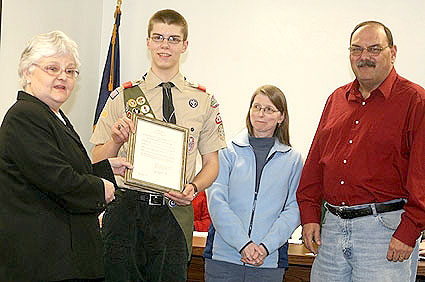 Lee has approached the Odessa Village Board about it, and was warmly received. There are obstacles, such as liability concerns, since there is a steep drop into the water from and near that walkway. But the board gave its preliminary approval, and said it would work with Lee in developing a plan that could be realistically achieved. Lee is a Scout in Troop 3030 in Odessa. His initial ideas for the park have included landscaping with trees, flowers and shrubs, a perimeter gravel path, and a couple of benches. "It's great to see the younger generation take the initiative," said Mayor Keith Pierce. Amen to that. Hail to the serious-minded among our young adults -- folks like Adam Rice and Lee Sidle Who knows? It could lead, someday -- and perhaps with the help of the Internet -- to "Hail to the Chief." Photos in text: Top: Adam Rice (top) receives a commendation from Watkins Glen Village Mayor Judy Phillips in March 2010, with his parents, Bill and Mary, at his side. Bottom: Lee Sidle at a recent Odessa Village Board meeting. ***** And earlier: A time of love &
