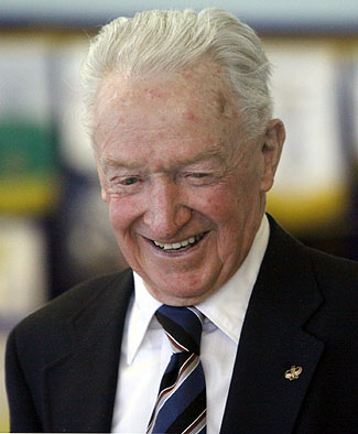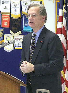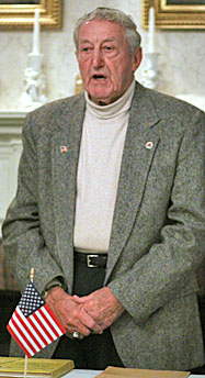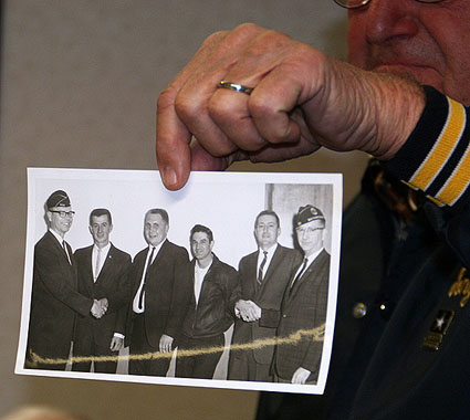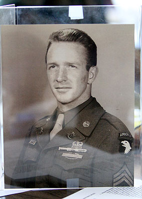 It was, he said, "the only time in my life when I thought I was starving. Food was hard to come by. Then, two days before Christmas, we received some bread, and I ate some and tucked a couple of pieces away." On Christmas Day, he said, he pulled that bread out and shared it with some of his fellow soldiers. "It was a blessing just to get something to eat. I imagine those men, if any are still alive today, remember that bread." Eventually, he said, he and the other Airborne soldiers "were pulled out" of there, and were soon "rushed across the southern part of Germany toward Berchtesgaden. For some reason they wanted the 101st there before anyone else." His unit was the first to arrive at that location, which had been used by Adolf Hitler as a retreat. Hitler was by then dead in Berlin by his own hand. While at Berchtesgaden, ensconced in comparative luxury -- which is to say he was indoors -- Falvey joined in the celebration that came with word of the war's end. "I popped a bottle of champagne and took a drink," he said, "and then threw the bottle out a window. But I didn't open the window." He smiled. "I was never proud of that. It was part of the foolish things and excitement that came upon word that the war was over." ***** Red Falvey, a sharp, spry and very active man in this, his 90th year, remembers a World War II general named Lee who told the troops heading into the battle for Europe that they had "a rendezvous with destiny." It was a phrase borrowed from a speech made by President Roosevelt in 1936, but it struck a chord there in 1944, with all hell about to be unleashed "We didn't seem too concerned with what our future would be," Falvey said of the Airborne soldiers with whom he had prepared for the invasion -- the assault on Hitler's well-entrenched troops. "We had trained hard; we just wanted them to let us loose to do our best." With his Bible packed in his gear and grenades and other weaponry strapped to his belt and slung over his shoulder, Falvey -- along with the other men of the 506th Parachute Infantry Regiment -- made the hourlong flight on D-Day over France, and floated down onto it. And somehow -- a couple of frozen toes his only damage of note -- Red Falvey made it through from there to the end of the war and to that bottle of champagne. "There were 16 million men in the service," he said, "and I was a little piece of it. I did the best I could with what I had. I had my rendezvous with destiny." Considering the dangers he faced, he also had fortune smiling upon him -- although he prefers to call it "providence" and "divine intervention." "There's no doubt in my mind," he said of his war experiences. "I was kissed by the angels." Photos in text: Red Falvey at the Rotary luncheon, and a World War II picture of him in a plastic frame circulated among the Rotarians. ***** And earlier: The legacy of a