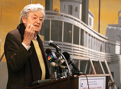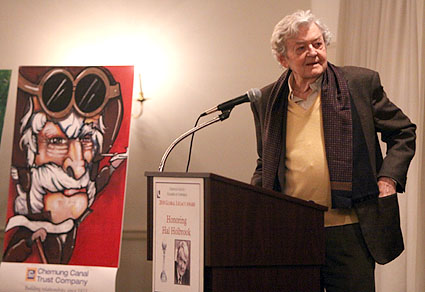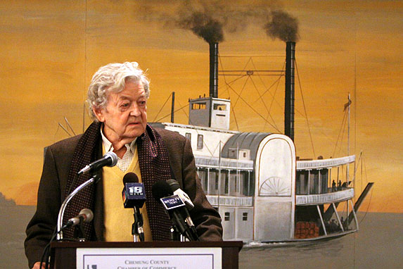 Photos in text: Top: Hal Holbrook examines his Global Legacy Award. He is the fifth such recipient of the Chamber of Commerce honor. Previous winners were Tommy Hilfiger, Joey Sindelar, Rob Brown (who portrayed Ernie Davis on film) and former Congressman Amo Houghton. Next three: Holbrook at the podium, responding to questions. Bottom: Holbrook at a table during the Chamber of Commerce party that followed the press conference, talking to a guest. ******* And earlier: Should truth be