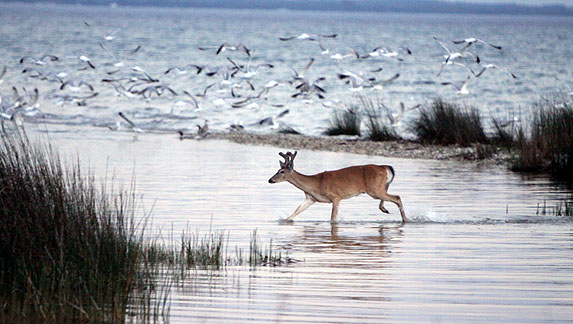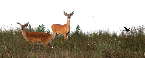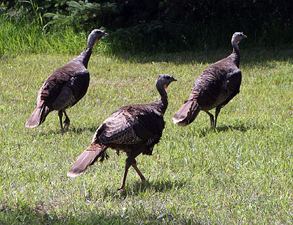 We get wild turkeys on the lawn, too, sometimes singly, sometimes in pairs, and occasionally as a threesome. They generally cross the entire yard, moving from east to west for a reason that eludes me. We once saw a coyote chasing a deer across the front lawn. The latter went flying by, angling in from the dirt road to the west, and disappeared into the woods on the east. The coyote blazed by in hot pursuit a moment later. It all happened so fast, I could only watch in wonder; there was no time to fetch a camera. But the coyote population seems to be down this year, and the deer are as a result a good bit bolder than usual. They appear in fields around the island, go down to the shoreline for a drink, or even meander along the Island roads at dusk, when there is little or no traffic.