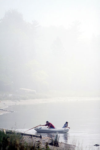 Sleep has been a major reward through the first three days here. I grabbed about 9 hours the night before last, a duration I haven't experienced in quite a long time. My sleep schedule, often dictated by my work on The File, normally is a broken hodgepodge of a couple of hours here and three more there. A 9-hour stretch was quite restorative. I plan to do a lot of hiking, a lot of reading, and a lot of visiting with my eldest brother, Bob, who arrived up here a week before I did. We normally see each other but once a year, so this time is quite valuable from a family standpoint. I think I will tackle some writing, too -- possibly a sequel to my novella Cabins in the Mist. Or I might pick up where my novel The Maiden of Mackinac left off, placing the focus on a favored character named Tobias, a hairy creature called a Tajahenus who -- when we last saw him -- was living in a cave on Mackinac Island. That's an island two removed from Bois Blanc, off to the west -- every bit the tourist mecca that Bois Blanc isn't. Speaking of The Maiden of Mackinac, I visited the Bois Blanc Island library/museum on Tuesday -- one of three days each week it opens in the summer. They had three copies of Maiden there (along with my other books) -- which is remarkable considering I only published 100 copies of it. Finally ... the fog was thick this morning, and hung around until after 10 a.m. I snapped a few photos of it, a couple of which are presented here. I don't imagine I'll be doing much photography up here, but if the opportunity presents itself ... Meanwhile, I trust the heat wave back home will pass soon. I understand it's supposed to get cooler on Friday. I hope so. Photo in text: A couple shoves off from the shoreline, heading into the fog.