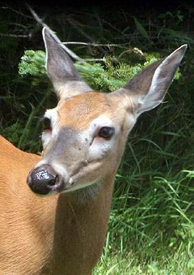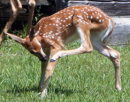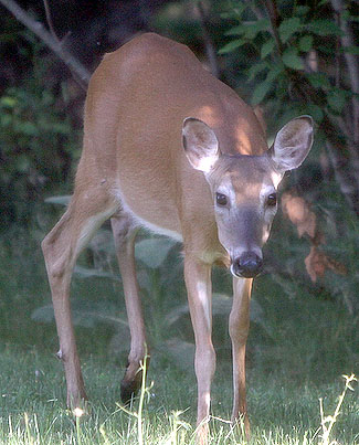 I was seated on the front porch, a wraparound structure, when a motion to my left caught my eye. It was a deer foraging in the yard, just beyond the screened enclosure. I stood slowly, went inside, grabbed a camera and managed a single shot before the animal bolted toward the rear of the property. A couple of minutes later, I glanced out a window in the back of the cottage and saw the same deer again, along with a slightly smaller adult and a fawn. They were taking their time, wandering about the yard, foraging. I took the deer shots above and below through a couple of different windows. It was several minutes before the deer realized they were on Candid Camera; when they did, they hustled away, heading toward a path that leads beyond the yard's rear border. Photos in text: Fawn tries to scratch his nose; and a day earlier, turkeys waddle across the cottage's front lawn. Above and below: The cottage visitors. ***** And death pays a visit: Victor Babcock, a lifelong Island resident, was seated Wednesday in Hawk's Landing -- one of two eateries on Bois Blanc -- staring out the windows toward the waters of the Straits of Mackinac. Behind him was a table full of relatives, but Victor wasn't engaged in their conversation. He just kept staring at the water. His gray hair was unkempt, his blue eyes were misting, and his color was pale.