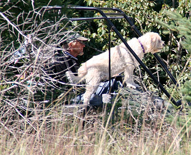 There were guest speakers, too, all of them ripping on the established government leaders, and all doing so in a very loud way, the sound system being incredibly forceful and ... well ... a bit deafening. This was a Tea Party party down in Watkins Glen, a gathering called Patriot Rally in the Glen that was organized by the Odessa Tea Party. It attracted an estimated 450 people -- and I have to think almost all of them were there for one primary, overriding reason: they wanted to see Carl Paladino, Republican candidate for governor of New York. The whole gathering, in fact, seemed pointed toward Paladino's arrival -- which was understood by one media member to be set for 1 p.m., although the printed program didn't have him speaking until 3:40. When I arrived shortly after noon to try and sort out his schedule, I was told he'd likely be getting there at 2:30. In fact, he arrived at about 3:20 or so. The media was out front waiting for Paladino as his vehicle approached, but his driver took him around to the Community Center's back entrance, and he hunkered down in a darkened rear room with his entourage -- and picked up a disciple while he was waiting: a 5-year-old Watkins Glen girl named Macy Fitzgerald who was present with her father and wandered back to see the candidate's dog -- a creature wearing a "Pets for Paladino" doggy jacket.
