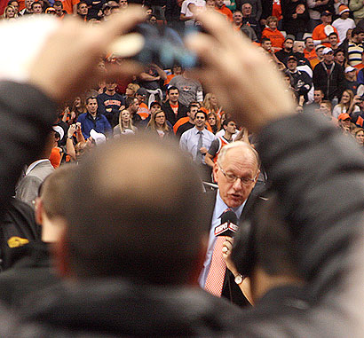 things By Charlie Haeffner Odessa, Oct. 11, 2010 -- I'm not a big proponent of Facebook, although its rise is fascinating. It proved gratifying, however, on my birthday -- 10-10-10 -- when I received dozens of messages from well-wishers through that social network. It seemed like another five or six greetings popped into my e-mail every half hour or so. At last count, there were 50 -- some from forner area students whose athletic exploits I covered when they were in high school: Courtney Warren, Michelle Thorpe, MacKenzie Myers, Sparky Gardner, Jessica Smith, Margie Amisano, Amy Centurelli, Justin Kibbe, Stephanie Letteer, Mallory Richards, DJ Locke, Nicole Long and Maggie Lucero. And there were some notes from current high school athletes, too. To each of you, I say thank you for your kind gesture. It's always nice to be remembered, and this was appreciated. ***** I received a note from TJ Love updating me -- and by extension you -- on a milestone reached and a milestone approaching in the world of Watkins Glen High School boys soccer. The one reached was a school career assist record of 44 set last week by junior Austin Stephany, breaking the record of 43 held previously by Mike Beber. The approaching milestone is Coach Henry Ferguson's 100th victory. With last Friday's win at Notre Dame, he has 94 -- "so if all works out Henry should have it this year deep into sectionals," or early next year, says TJ. Henry is in his ninth season coaching the Senecas. In order, starting in 2002, his teams have won 14 games, 10, 11, 5, 9, 6, 14, 14, and (thus far this year) 11. ***** Back to birthdays. Since Sunday was mine, it was also Kaz Estelow's. She's a teacher at WGHS, and basically just a kid, 20 years my junior. (Let's see: That means she was about three weeks old the first time I got married. That kind of puts things in perspective.) Anyway, happy birthday, Kaz. One more thing about birthdays: They conjure up all sorts of thoughts in me -- measurements, if you will, of how far I've come and how far, maybe, I have yet to go. None of us can say for sure how much time we have on this orb, of course, but as I said to a friend: Maybe, just maybe, my time isn't winding down yet. Maybe I'm just starting. I'm not sure if that's an optimistic or pessimistic viewpoint -- but as long as I can create, can write and photograph and enjoy doing both, I will consider it a positive outlook. ****** The high school sports season is nearing a conclusion, and it's been fascinating so far -- largely because of unexpected fresh faces who have excelled to impressive degrees. At Odessa-Montour, Jocelyn Garrison, a senior transfer from Corning West, has set a school single-season scoring record and thus garnered most of the publicity on a talented squad (Michelle Melanson, Katie Ray, Allison Stamp etc.) that has won a division title. And at Watkins Glen, the most surprising story has been the sudden rise of 8th grader Taylor Kennard as a consistent winner for the varsity cross country team. She too has, as a result, received a good deal of publicity, although the stunning success of the team (it went 12-0 in the regular season) has involved virtually every member of the squad, which is, I think, 10 girls strong. Leading them are co-captains and seniors Amber Swartz and Shannon Hazlitt. So ... kudos to Garrison and Kennard and to their teammates. They've all done well, and certainly enlivened the coverage presented here. And kudos to a couple of other unexpected successes at WGHS: Chilean exchange student Maria Chavez in volleyball, and freshman Samantha Gill, who has provided strong support for returning standouts Haleigh Wixson, Haley Tuttle and Victoria Wixson on the swim team. Both Chavez and Gill have set high standards and contributed significantly to the success of their squads. ****** And earlier: Carl Paladino addresses the crowd at the Watkins Glen Community Center. The cult of celebrity
