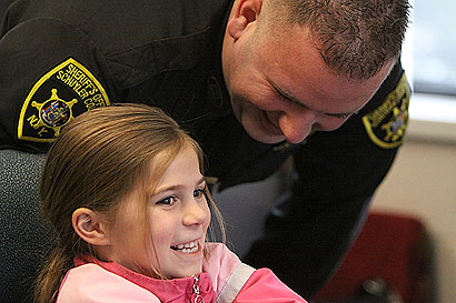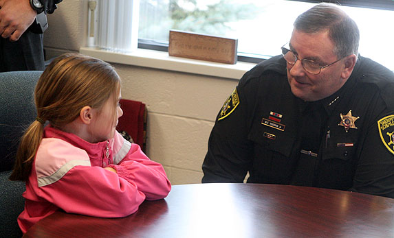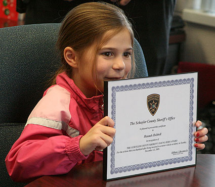 The details of how Hannah climbed from the wreck and sought help, and returned to free a friend of hers named Summer Eldridge have warmed many a heart around here, and attracted the attention of other media. And those actions earned Hannah a special award Thursday there in that room with all of those large people. Sheriff Bill Yessman coordinated the award effort, preparing a special certificate designating Hannah a Young Hero. He presented it to her there in front of two TV cameras, the Odessa-Montour Superintendent of Schools, James Frame, and the deputy who first came to Hannah's aid out there along the road to Van Etten: Andrew Yessman, son of the Sheriff. Andrew used to go to that same school, B.C. Cate, a few years back. Also in the room were Hannah's grandmother, Barbara Hubbell, aunt Emily Hubbell, great uncle Blaine Hubbell, grandfather Robert Hubbell, great grandmother Clara Wheaton, and sister Kylee, a fifth-grader at Hanlon Elementary School in Odessa. Kylee was leaning against a window in the back of the room, recording the event for posterity. "Everybody's here," the sheriff told Hannah, "because you did a very special thing the other day when you helped your friend and your mother. We decided we wanted to do something special for you, too." After he presented the certificate -- nicely framed -- to Hannah, gifts were presented to her by Andrew Yessman, and she was interviewed by Kelsie Smith of WENY-TV while a cameraman from WETM kept his camera rolling, in tight on Hannah. The interview effort proved fairly futile, for Hannah was a bit overwhelmed by it all. She gave shy, short, soft responses until finally Smith gave up. But it still made for good TV later, because the child is cute ... and the circumstances of the story are compelling. ******