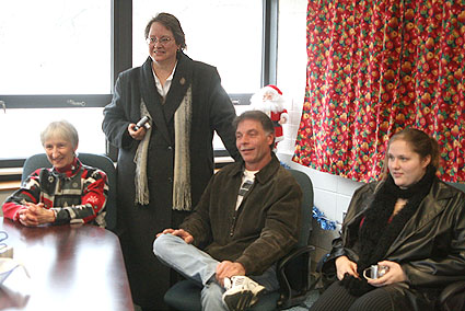 "But I don't usually wear the uniform," he said. "I try to disassociate one from the other." On this day, though, he was dressed in a black uniform, looking very official. It was because of the special nature of the day. He has, on occasion, presented a Citizen's Certificate of Appreciation "to people who do something like this or contribute in some significant way to the county. But those have always been adults. This is the first time we've ever presented a Young Hero Award." ******* Imagine if you will that you are a wisp of a girl, short and slight and easily overwhelmed by giants in a room who are all looking at you. Imagine you are that girl riding in the back seat of a car driven by your mother on a journey that goes suddenly wrong -- your world spinning and then stopping abruptly, violently, as the vehicle hits a tree. Imagine you are stunned and in pain -- that your ankle is caught by twisted metal where the side of the car has buckled inward. Imagine your mother is trapped in the front seat, injured, not responding ... or responding in obvious pain. Imagine that your heart is beating and confusion reigns. Your whole world has suddenly been reduced to a metallic trap, with windows broken in all around you. Shattered glass is suddenly a part of your world. It is cold, and your friend seated next to you is frightened, and you don't know what to do. Scream? Cry? Pray? Or do you somehow free yourself despite the pain, and get out? Then what? You are six years old, not exactly full of emergency experience. What do you do? That's how to measure this amazing feat -- by putting yourself in the shoes of a 6-year-old, if you possibly can ... and by walking in those shoes from that car, and scrambling in those shoes up that embankment, and standing in those shoes as you wave at passing motorists, urging them to stop. And then by returning in those shoes to free your friend before climbing the embankment once again. ****** This 6-year-old is decidedly special. But what she did, says her family, is something that doesn't surprise them, because she can be very focused, very logical. And that's how she responded in this emergency. She acted with a calm and coolness that are uncommon in one so young. But there in that room at B.C. Cate, she looked like you might expect a 6-year-old to look under those circumstances: shy and taken aback by all of the attention, and not given to long answers. But the others in the room spoke for her -- the sheriff, the deputy, the family members. They talked about the accident, and the aftermath, and the publicity, and the award. They talked about the remarkable nature of what had transpired out on that road to Van Etten. "We are so thankful," said Barbara Hubbell, her grandmother. "Really ... this," and Barbara motioned toward Hannah, as if to encapsulate all that the little girl is and all that she had done on that day, helping to save her mother. "This," she said, and hesitated again, seeking the words. And finally she found them. "This is our Christmas miracle," she said. Photos in text: From top: Hannah with her Young Hero Award; Hannah talks to Deputy Andrew Yessman; members of the family (from left, great grandmother Clara Wheaton, grandmother Barbara Hubbell, great uncle Blaine Hubbell, and aunt Emily Hubbell); Hannah's sister Kylee records the ceremony. ****** The