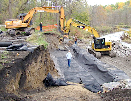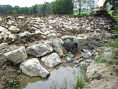The SWCD presented three Merit Awards and two Lifetime Service Awards: -- Merit Award recipients were Tom Beach and Brian Sidle from the Town of Cayuta Highway Department, and Todd Jansen from the Town of Horseheads Highway Department. Sperry Navone, Chief of Staff for New York State Assemblyman Philip Palmesano and also representing State Senator Tom O’Mara, presented joint proclamations to all awardees. Alison Hunt, District Director for Congressman Tom Reed, also presented the award winners with special certificates from the Congressman’s office. -- 25 stream and road stabilization projects that stabilized over 22,000 feet of streams and road ditches with installation of over 15,000 tons of rip rap; -- over 70 acres of critical area seeding with Soil and Water’s Hydro-seeder; --15 large-scale farm projects, among them: forced air composting of winery pomace; a covered barnyard; a covered manure storage; a silage leachate total collection system; drainage work, diversions and waterways; riparian buffer creation; alternative watering facilities; rotational grazing projects; a commodity barn; and access road improvements. Site repair work by three conservation districts involved the use of heavy equipment and large rocks. (Photo provided) 3 Soil and Water Conservation Districts join forces for implementation effort Special to The Odessa File
