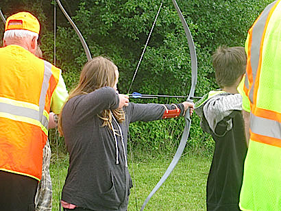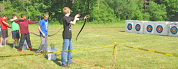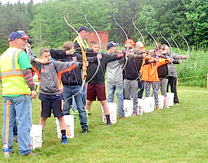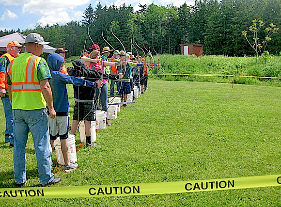 The Schuyler County Soil and Water Conservation District sponsors the AEM program, and the Farm Bureau and Schuyler County Agriculture and Farmland Protection Board are co-sponsors of the awards with the Conservation District. Angus Glen Farm is recognized regionally for the quality of its Angus beef cattle both genetically and for flavor and tenderness. The Chedzoys also are known for their knowledge of silvopasturing, where cows can graze in the woods, and for their pasture rotational grazing system -- both done with extreme care to protect soil health and forest quality. Students practice their newly learned archery skills at the Conservation Field Day. Hunting club hosts education program