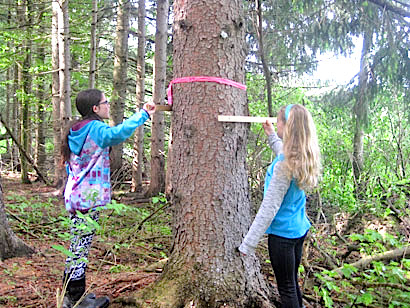"Special thanks," said a spokesperson for the Schuyler SWCD, "are extended to McIntyre’s Bait and Tackle in Beaver Dams for the donation of worms for the fishing station and to all the speakers who worked with the students." “This is the third year Conservation Field Day has been held at the Hunting Club and their generosity is deeply appreciated,” added Rebecca Smith of the Soil and Water District. “This local club loves to help youth and adults learn more about the natural world.” Top: Alyiah Bentley of Watkins Glen Central School shoots at the archery station. She hit the bullseye, and about the same time so did Watkins student Thomas Goltry-Koots. Second: Dallas Johnson of Watkins Glen Central School caught a nice bluegill during the fishing station. The fish was released. Bottom: Katy Adams and Victoria Brewster of Odessa-Montour Central School measure a tree diameter with Biltmore sticks at the forestry station taught by Bob O’Brien of Cotton Hanlon Inc. (Photos provided) SWCD marks Earth Day with its annual tradition: the Green Arbor Program