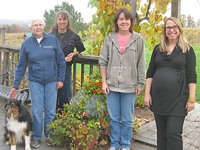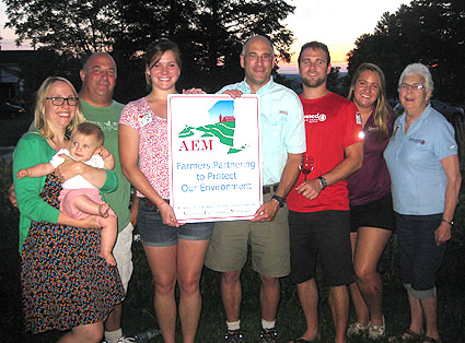 The picnic, held at Hazlitt Winery in Hector, attracted 140 people, including town and county elected officials, State Senator Thomas O’Mara, and Alison Hunt, Deputy District Director for Congressman Tom Reed’s office. This is the seventh year of the AEM signage program in Schuyler County and the Stamp family is the 12th Schuyler farm family to receive the award. “AEM is a state program, and to receive a sign, a farm must have a high level of environmental stewardship and a solid commitment toward implementing practices to address the farm’s priority water quality concerns,” said Elaine Dalrymple, Conservation District Field Manager. Lakewood was one of the first farms in the county to participate in the AEM program. The Stamps have been farming in their present location for about 65 years, although their Schuyler ancestors and farming heritage go back many more generations. The fourth generation is now working on the farm, which is 220 total acres and 82 acres of grapes with at least 15 different varieties being grown. A winery was started 25 years ago and has expanded into one of the largest in the Finger Lakes. This farm has implemented many best-management practices (BMPs) to reduce nonpoint source pollution, including the use of row middle mulch and cover crops, diversion ditches and vegetated headlands to reduce erosion, an agrichemical mixing facility to prevent any potential pesticide spills from entering the environment, nutrient and integrated pest management including soil and petiole testing, pest scouting, and precise weather monitoring. The Stamps host many educational programs on their farm for both the farming and non-farming public, youth and adults. They are involved in numerous viticulture organizations that improve and promote the industry, including the Seneca Lake Wine Trail and the NY Wine and Grape Foundation. Eleven members from three generations of the family are actively involved with the farm. “We are very proud to be a family farm that grows and produces high quality grapes and wine, and know that to have our fifth generation in farming we need to protect our soil and water. The AEM program, in its many facets, has been very helpful to us in this endeavor,” said Chris Stamp, Lakewood owner. The Schuyler County Farm Bureau and the Schuyler County Agriculture and Farmland Protection Board are co-sponsors of the awards with the Conservation District. To learn more about the AEM program in Schuyler County, visit www.schuylerswcd.com or call the Schuyler County Soil and Water Conservation District at 535-0878. Photo in text: From left,: Erin Stamp, wife of Dave, holding daughter Quinn; Dave Stamp; Amelia Stamp, daughter of Chris and Liz; Chris Stamp; Ben Stamp, son of Chris and Liz; Abby Stamp, daughter of Chris and Liz; and Bev Stamp, mother of Dave and Chris. (Photo provided) Schuyler