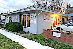 Photos in text: The Dutton S. Peterson Memorial Library in Odessa (top) and its seasonal book barn.