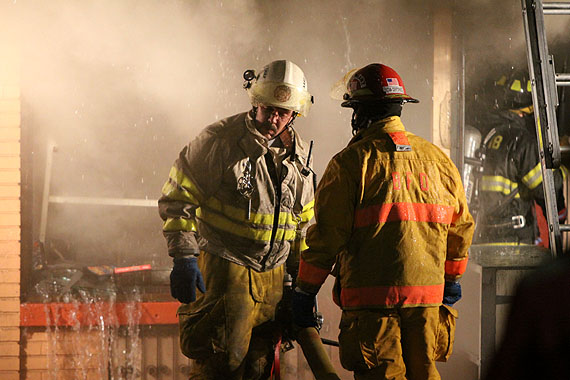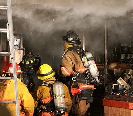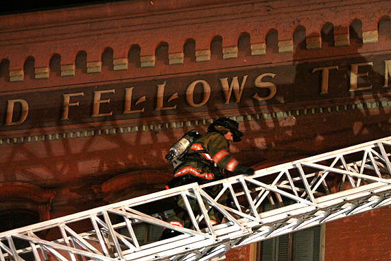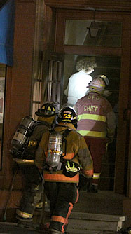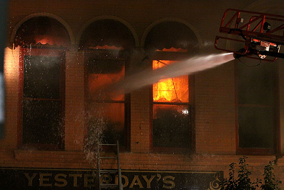 Observers gathered along the sidewalks across from the fire, and were repeatedly moved back by deputies. However, those with a stake in the matter -- such as Guild and Henneman, along with their friends -- kept a vigil as the night progressed past 9 p.m. and the temperature dove. Firefighters closely examined the buildings next door to the Cole-Royce structure -- separated from it, one fire official said, only by brick walls. To the south is a building housing Ambrose & Shoemaker Real Estate and the Leslie School of Dance, on the corner of Franklin and Fourth Streets. To the north is the vacant News Room building, including its recently occupied apartment upstairs. There was no report on whether anyone was there at the time the fire broke out.