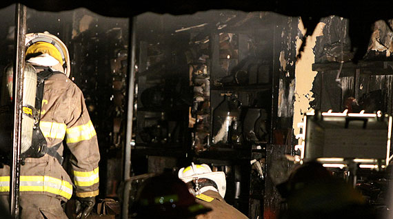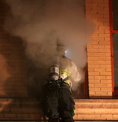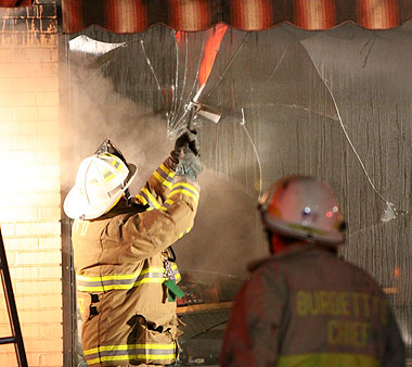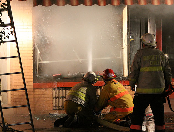 Firefighters shoot water into the interior of the Village Variety Shop after smashing a window. Blaze