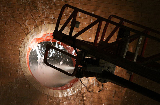 A hose at the end of a truck ladder blasts the second floor after flames broke out there.