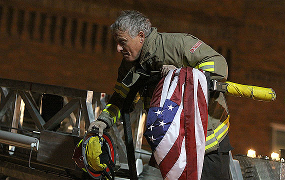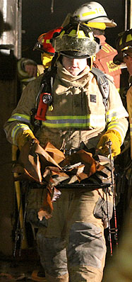 Left: The building's 1925 dedication sign sits above second-floor windows. Right: A firefighter carries some debris from the Village Variety Shop.