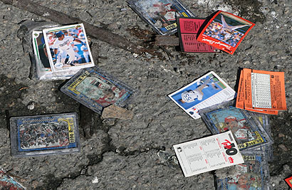 He was treated at Schuyler Hospital for what fire officials said were minor cuts and burns, and was released. He was reportedly back at the scene in the morning, although access to the building was blocked off by police tape and plywood. The tape in the front of the building was wrapped tightly against the exterior until early afternoon, when police -- at the request of Mayor Judy Phillips -- extended the no-access point to include the sidewalk in front. Phillips said she was concerned someone might be injured by falling debris, and noted that there was also glass on the sidewalk from the night before. Photos in text: From top: The front of the Cole-Royce building, a display window in the Village Variety Shop, and sports cards that had been part of the shop's merchandise. They were strewn about the parking area at the rear of the structure..