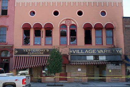 Linda Henneman, proprietor of Yesterday's Paradise adjacent to and above the Village Variety Shop, has said her items -- reportedly heavily damaged -- were not insured. They had been rejected by three different insurance agencies she approached. There was no official word on whether Village Variety Shop proprietor Ed Peters' merchandise was insured. "There's no risk of collapse," said Jud Smith about the building. "But it will have to be cleared out and cleaned up and brought up to code." Also necessary: repairs where holes exist in the flooring of the second story. "There's one big hole," he said, "and another smaller one." The fire department arrived at the scene within a couple minutes of the call, he said, "and we wanted to save as much of the building as possible. But our goal was to keep the flames from walking down the block."