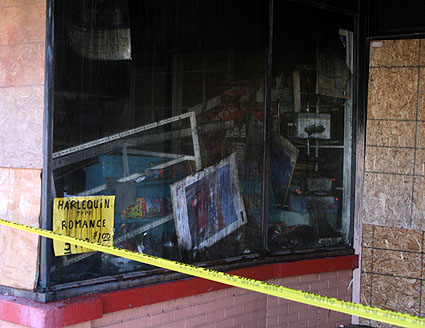 The north wall of the Village Variety Shop and its merchandise were charred.