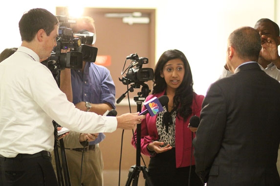 The media surrounds District Attorney Joe Fazzary, right, for comments after the sentencing. Trappler