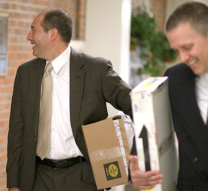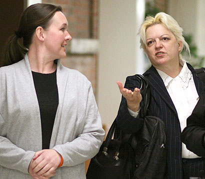 ***** When the day's testimony was all over, Fazzary explained that he has three major "burdens" in the trial, each of which accounts for the methodical pace at which he is approaching the matter. "First," he said, "I have to show that Daniel Bennett was murdered. The defense hasn't stipulated to that, so I have to show it. "Second, I have to prove that Thomas Wesley Borden and Nathan Hand physcially carried out the murder. "And third, I have to tie them to Alice Trappler. That's the order I have to go -- the murder, who did it, and along the way I'm showing bits and pieces on how Alice Trappler is connected. "I'm happy," he added, "with the way the testimony is going." Defense Attorney Susan BetzJitomir had a different take on the progress of the case. She said the prosecution's case against Trappler is largely based on the word of Nathan Hand, who has given what she described as often-changing accounts of that night. Hand's testimony, she said, is "worthless." When asked about text messages Fazzary mentioned in his opening statement Friday that were sent between Borden's phone and Trappler's, BetzJitomir shook her head. "The text messages aren't damaging," she said. "Besides, they might not even get in, since they are basically hearsay. Besides, we know (from Catharine Young's testimony) that Nate (Hand) was using Thomas Borden's phone" (on the night of the murder, when he called his girlfriend around midnight to say he and Borden would be returning home soon). "This is really an interesting case," she said. "You can't make this stuff up." Alice Trappler, she said, "wasn't involved. I think I can prove it in the first two minutes of my closing. I know that might be a little bold, but I really think I can prove it." Next up: Testimony resumes today (Tuesday) at 9:30 a.m. The trial will continue through Thursday, then take Friday off due to Drug Court using the courtroom. Then the trial will run five days the following week. Photos in text: Top: Defendant Alice Trappler, left, and her attorney, Susan BetzJitomir, after court Monday. Middle: District Attorney Joe Fazzary, left, leaves court Monday with State Police Investigator Lee Stonebraker. Bottom: Defense attorney Susan BetzJitomir is interviewed after Monday's session.