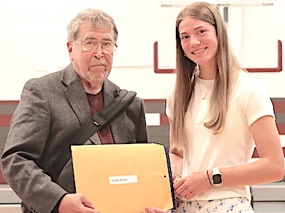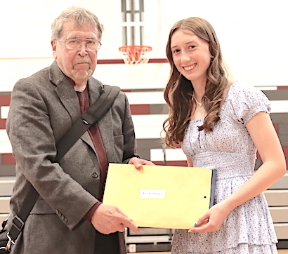 Each of the two presentation ceremonies -- in the Odessa-Montour High School's Jack Davis Gym and in the Watkins Glen High School library -- featured a guest speaker: 2023 O-M graduate and three-time Tribute Award honoree Hannah Nolan in the Davis Gym, and 2009 WGHS graduate and four-time Top Drawer 24 honoree Katey Cheplick in the Glen library. Nolan is a track athlete attending SUNY Cortland (and, now that school is out, substitute teaching in the O-M district), while Cheplick is an Associate Vice President for Technical Solutions and Systems (IT) at Keuka College. Speaking to audiences that included not only the honored students, but the students' parents as well, both Nolan and Cheplick offered congratulations for the achievements leading to this award. They told of their own experiences and imparted the message that the honorees will need to draw on those characteristics that have brought them this far -- in particular a strong work ethic, not to mention determination-- even more as they face the challenges and seize the opportunities ahead of them in life. After the ceremony, each was accessible to students and parents at a reception. This year's Odessa File Tribute 24 Award honorees, by school but in no particular order, are as follows. Photos in text: Speakers Hannah Nolan (at O-M, top) and Katey Cheplick (at WGHS). (Photos by Jon Haeffner) ********* O-M's Tribute Award Honorees:About each O-M honoree: Cara Reynolds: This year's O-M Valedictorian with a 98.26 GPA, she plans to attend SUNY Delhi with an eye on a career as a veterinarian. Co-President of the Senior Class, she is a member of the National Honor Society, Drama Club and the Superintendent's Student Advisory Council, and volunteers for the American Heritage Girls. She competes in track and was an Odessa File First Team All-Star in swimming after winning four races at the Section IV, Class C meet, helping her team to its eighth straight title. "She is someone who enjoys being part of the program," said her track coach, Skip Strobel. "She will take on any role to assist the team and can often be found cheering on her fellow throwers when not competing." Added her swim coach, Jason Westervelt, "Cara has an incredible work ethic in the pool and knows how to rise to the occasion." This is her second year on the Tribute 24 Award team.