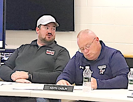 3. The two boards held open the possibility of a second meeting to further discuss consolidation, with that one likely in Watkins Glen. 4. Both boards made clear that in moving forward, should they decide to do so, their concerns -- and that of their residents -- will include the matter of identity. There must be, said one Bradford board member, an absence, in any consolidation, of "one district being absorbed by the other." "This would be a merger," said Watkins Board member Chad Hendrickson. Added Superitendent Marshall: "We're partners in this." To which Superintendent D'Alleva noted: "We're more similar than we are different." Photos in text: Top: Watkins Glen School Board President Keith Caslin, right, and Bradford School Board President Alex Walters at Tuesday's session. ************* And earlier:Watkins BOE gives go-ahead for talks with Bradford about possibility of consolidation