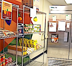 Present from the Hawk House, in additon to Popovich, were students Amelie Woods, Amy Field and Paige Ells. On hand from the Schuyler County Legislature was Legislator Laurence Jaynes. In promoting the check presentation, the Food Bank of the Southern Tier said in a press release that "the event will spotlight how the district has created a self-funding model through its student-run business, the Hawk House, which donates proceeds to help sustain the (Dub-G Market's) work in supporting local families." The relationship between the two student-run organizations, it added, could serve as "a model for other schools seeking long-term, student-led solutions to food insecurity." Photos in text: Top: Looking from the doorway into the Dub-G Market.