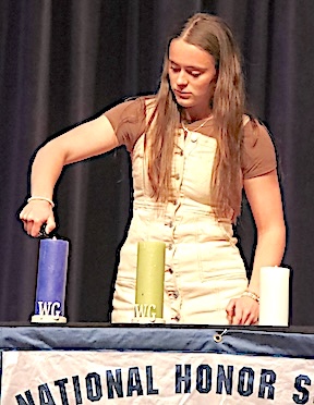 The evening concluded with photos by friends and relatives, and with snacks in the hallway outside the auditorium. Photos in text: Top: NHS member Emily Melveney lights the Candle of Scholarship representing one of the Honor Society's four pillars.
