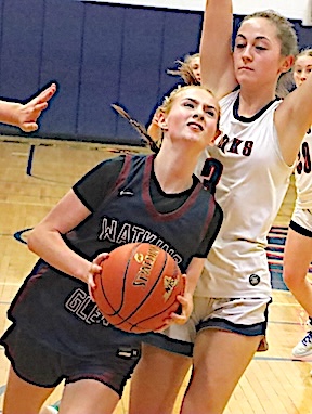 Top: Watkins Glen's Natalee Oliver drives to the basket.