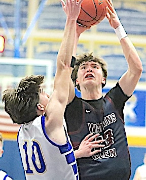 Top: Watkins Glen's Jaydon Scholtisek prepares to shoot. He sank the basket with eight seconds left in overtime and lifted the Lake Hawks' lead to 55-51.