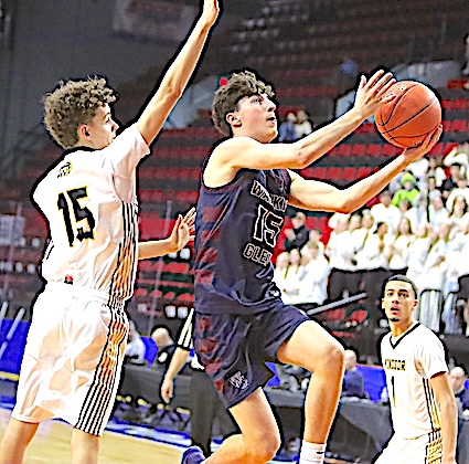 Left: Watkins Glen's Caleb Bresett takes the ball to the hoop. Right: The Lake Hawks' Jaydon Scholtisek shoots from the corner. He sank the 3-pointer with 1:32 left in regulation, building the Watkins lead to 58-54.