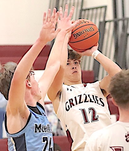 The Grizzlies trailed 20-12 after one quarter, 35-28 at halftime, and 49-34 entering the fourth period. Aaron Sutton led O-M in scoring with 14 points, while Connor Foggie scored 8, Kayden Garrabrant 7, Moe Zinger 5, and Hunter Mowry 2. The team sank 1 of 5 free throws. Moravia sank 8 of 15. The Grizzlies return to action Monday at home against Campbell-Savona. ******* Photo in text: Odessa-Montour's Connor Foggie (12) takes aim at the basket. Junior Varsity: Odessa-Montour defeated Moravia, 49-44. Mason Smith led the Grizzlies with 16 points, while Jeremy Updyke scored 14, Ethan DuPay 11, and Carson Bates 7.