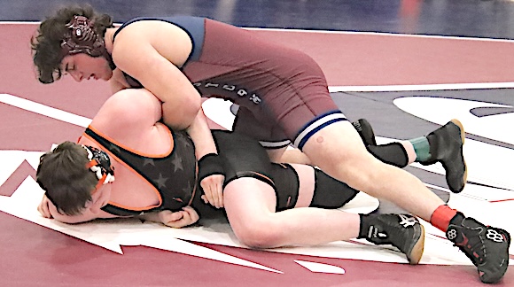 Ithaca won the tournament over Whitney Point based on tie-breaker criteria. Thomas Edison and Dundee also participated in the tournament. Four OM/WG wrestlers were awarded Most Outstanding Wrestler awards in their weight classes for finishing the tournament undefeated. Nicky Sorce (118 pounds), Daniel Coston (144 pounds), Jared Watson (175 pounds), and Patrick Croft (215 pounds) all finished with 5-0 records and MOW distinction. Declan Barry (285 pounds) also finished 5-0 but lost MOW recognition to Dundee's Caleb Bartlett on tie-breaker criteria (Most Pinfall Victories). Lucas Hoffman (126/132 pounds) finished the tournament with a 4-1 record. Isaac Rumsey (126/132 pounds) and Jotham Lynch (150/157 pounds) each earned three victories, while Wessly Haus (110 pounds), Dalton Smith (126/132 pounds), and Hunter Barrett (150/157 pounds) earned two victories apiece. Caden Hall (103 pounds), Dylan Senecal (138 pounds), Ethan Hornbrook (157 pounds), Emmitt Presutti (165 pounds), and Jett Starkweather (190 pounds) earned one victory each. OM/WG wrestlers return to action on Wednesday, January 7th when they take on Lansing in O-M's Jack Davis Gym. Wrestling is scheduled to begin at 6:30 p.m. Photo in text: The Storm's Declan Barry on the way to victory at 285 pounds against a Marathon opponent. Barry was 5-0 in the tourney.
