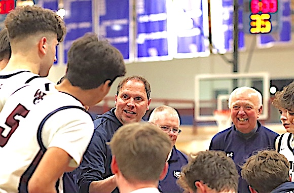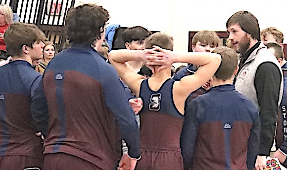 The WG/OM wrestlers huddle between matches with Coach Dan Batchelder (right).