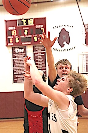 Left: O-M's Kayden Garrabrant attempts a shot while closely guarded. Right: In the JV game, Mason Smith drives to the hoop. (Photo by Gail Sgrecci)