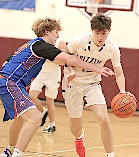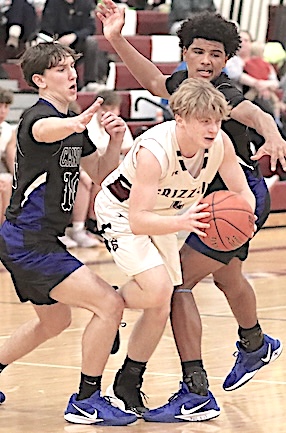 Left: O-M's Kayden Garrabrant (13) drives to the hoop. Right: The Grizzlies' Aaron Sutton (foreground) is fouled as he shoots.