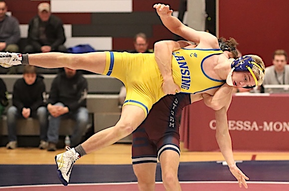 The Storm's Lucas Hoffman lifts his Lansing opponent at 126 pounds. Hoffman won. Storm wrestlers defeat Lansing, 58-12 ODESSA, Jan. 7, 2026 -- The Schuyler Storm (Odessa-Montour and Watkins Glen High School) wrestlers posted a 58-12 victory Wednesday night over Lansing in an Interscholastic Athletic Conference match in O-M's Jack Davis Gym.