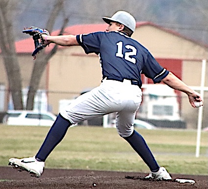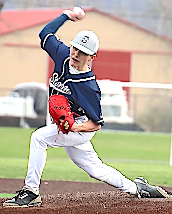 Photo in text: The Schuyler Storm's starter, Blake Thomas, delivers a pitch.