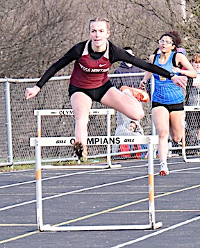Top: Odessa-Montour's Janne Anderson on the way to winning the 400 Hurdles.