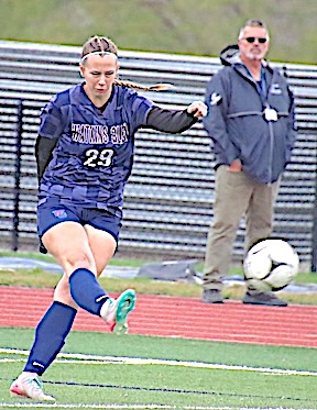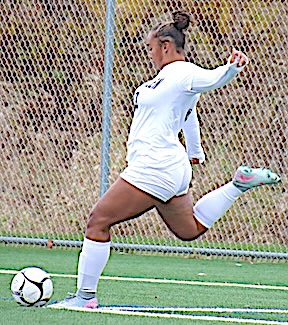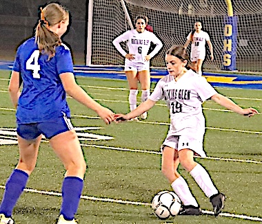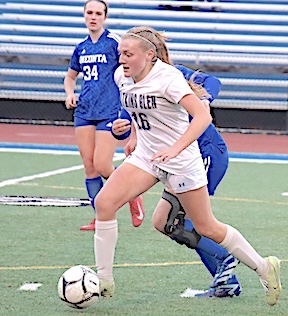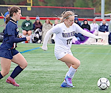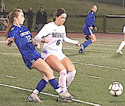 The game was played with nine players on the field for each team since O-M was short of the normal contingent of 11 players, and Watkins Glen, which had more than 11, opted to match the O-M on-field force. The Lake Hawks got two goals each from Micaela Sorce and McKenzie Wheaton. Watkins built a 1-0 first-half lead on Sorce's first goal, and pulled away with three second-half scores. Watkins Glen kept up repeated pressure near the O-M goal, where keeper Lily Mace kept the score close with some athletic saves. Photo in text: Watkins Glen's Micaela Sorce, right, sends the ball toward the O-M goal.