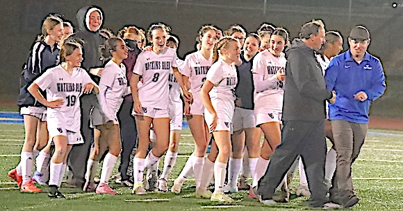 Wheaton's goal, off a pass from Natalie VanSkiver, came when she sent the ball just over the outstretched hands of the Oneonta goalkeeper and just under the crossbar in the right corner -- setting off a Watkins celebration. The game winner -- ending the necessity of a shootout -- ended a back-and-forth affair that saw Oneonta score just 25 seconds into the game on a fluky shot that squirted past Watkins goalkeeper Emma Cady. The Lake Hawks (now 14-3) evened the score two minutes later on an Ava Kelly goal (assisted by Rachel Vickio), and took the lead on a second Kelly goal at 16:33 for a 2-1 halftime lead. The first overtime period led to the second, and almost to a shootout -- where each team would have designated a number of its players to attempt penalty kicks. Aside from that first fluky goal, Cady played a solid contest, registering 12 saves that helped keep Watkins in the game. "It was another incredibly resilient effort tonight to get the win in double overtime," said Watkins Glen Coach Scott Morse. "In a strange game where we made several uncharacteristic mistakes, it would have been easy for the girls to get down and let it slip away, but they didn't. They showed tremendous heart and gave it their all to get a huge win on the road to earn the right to play for the sectional title. This team never quits, and I couldn't be prouder of them.