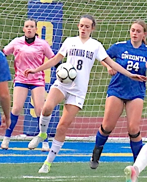Photos in text: Top: Watkins Glen's Ava Kelly closes in on the Oneonta net. She scored, sending the ball to the right corner of the net -- one of her two goals in the game. Middle: The Lake Hawks' Natalie VanSkiver, right, eyes a path around an Oneonta player. Bottom: Watkins' Michaela Wheaton meets an incoming pass near the Oneonta goal.