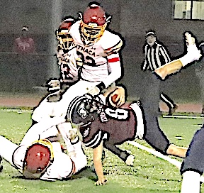 Mowry completed 5 of 11 passes for 78 yards and two TDs -- the one to Lagramada near the end of the fourth quarter, and one of 17 yards to Bryce Bockelkamp in the first quarter. Jared Watson was the Storm's leading rusher with 110 yards on 16 carries, while Coston gained 89 on 10 carries, and Dupay 20 yards on 6 carries. Watson and Noah Wright led the defense with four solo tackles apiece. Photos in text: Top: The Storm's Jared Watson gains some of his 110 yards.
