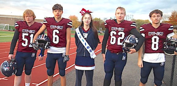 The Schuyler Storm football team's four seniors -- along with the lone senior cheerleader -- were honored in a pregame Senior Night ceremony. From left: Joey Chamberlin, Dominic Gould, Angelina Cagle, Robert Frasier, and Daniel Coston.