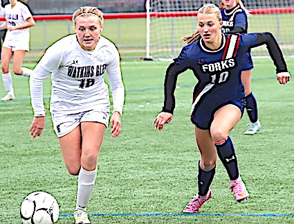 "The seniors who played their final game have built a lasting legacy for the program, winning three IAC and two Section 4 championships in their four years here. Though they will be missed, I know they will do amazing things in the future. I am excited for our future here with the outstanding players we have coming back next year. It's always hard playing behind eight talented seniors, but the underclassmen were terrific all season too, and it will be exciting to see what they can do next year. I'd like to thank all the girls, as well as Eric VanSkiver, for all the support this season. I'm very grateful to have the opportunity to be part of the program." Photos in text: Top: Watkins Glen's Natalee Oliver, left, and a Chenango Forks player pursue the ball.