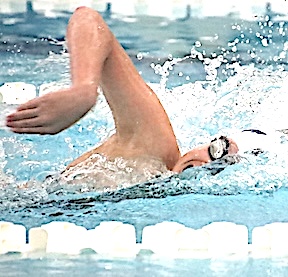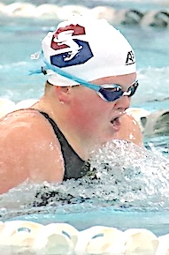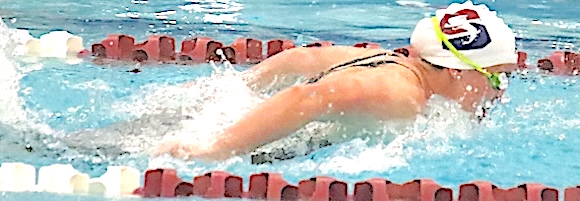 Storm swimmers claiming berths in the eight-person finals were: -- Makenzie Fish, Lizzi Fitzwater, Emily Melveney and Aubrey Klemann, 1st in the 200 Medley Relay (1:59.63) Lydia Schubmehl in the 200 Free and 100 Breaststroke, Willow Deragon in the 200 IM and 500 Free, Brie Blauvelt in the 50 Free and 100 Back, Ellie Bacon in the 100 Free and 100 Back, Eliza Van Ness in the 200 IM and 100 Fly, Rowen Stegner in the 100 Fly and 100 Back, Lizzi Fitzwater in the 100 Free, Wendy Coleman in the 200 Free, and Kaylin Smith in the 200 IM. Photos in text: Top: The Storm's Makenzie Fish enroute to second place in the 200 IM prelim.