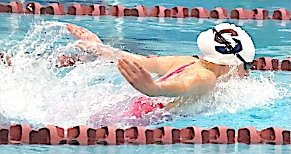 The Storm's Emily Melveney on the third leg of the 200 Medley Relay. Sect. 4 Prelims set field for Saturday finale WATKINS GLEN, Nov. 5, 2025 -- The Schuyler Storm girls varsity swim team posted a number of first-place finishes Wednesday as final and consolation final lineups were set for Saturday's Section IV, Class C Tournament in the Watkins Glen High School pool.