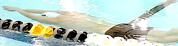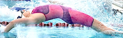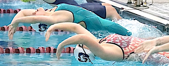 The Storm's Makenzie Fish at start of the 100 Backstroke, which she won. Storm swimmers fall to Southern Cayuga