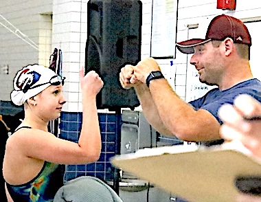 Left: The Storm's Lexi Emerson receives congratulations from Coach Jason Westervelt after she won the 200 Free. Right: The Storm's Lydia Schubmehl in the consolation finals of the 100 Breaststroke.